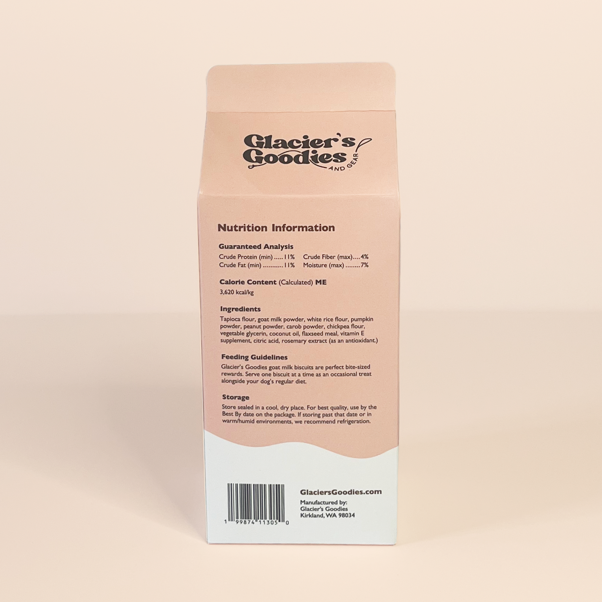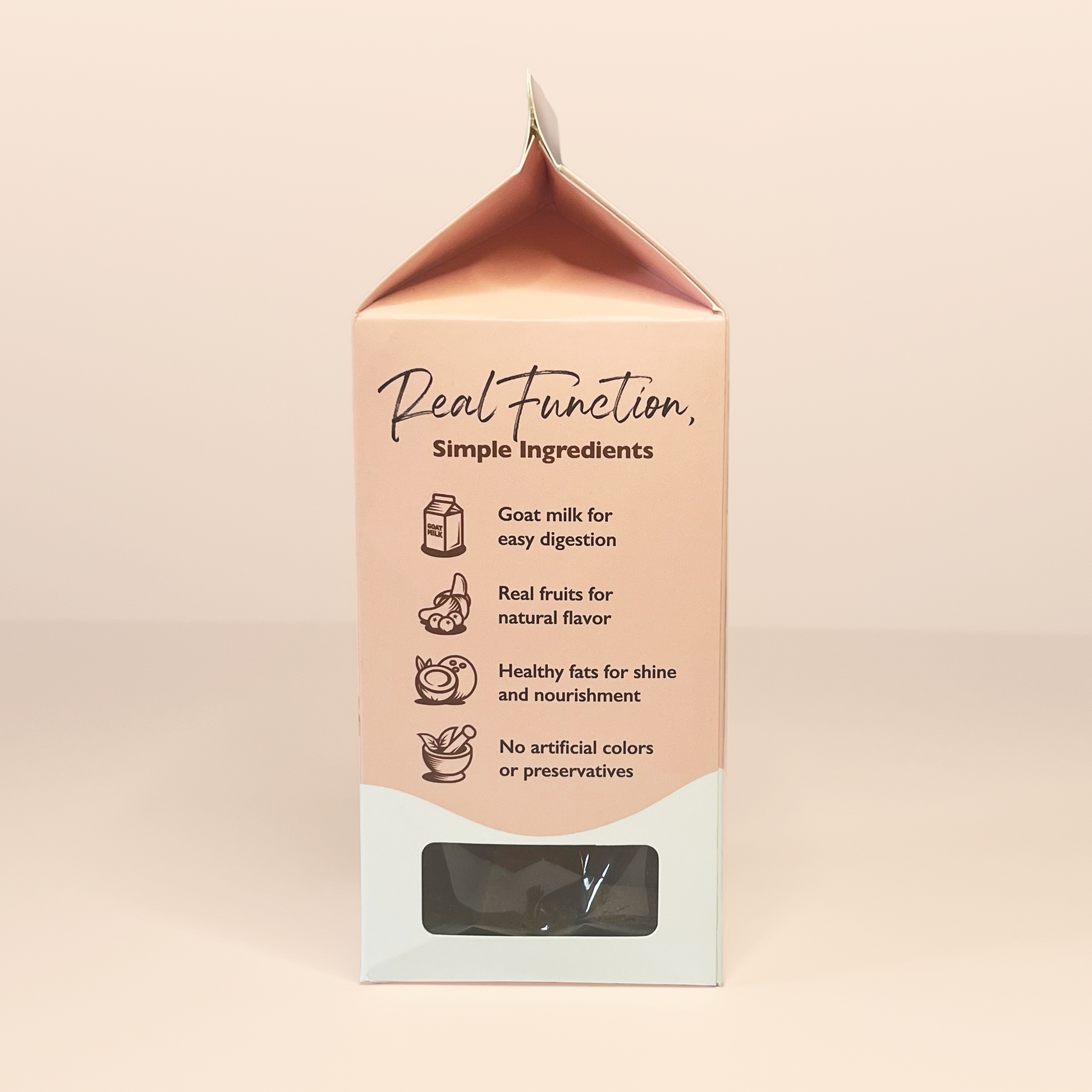 Every recipe begins with goat mulk, a nutrient-rich base that's gentle on digestion and packed with probiotics. From there, we add fruit for natrual flavor, tapioca flour and oats for balance, flaxseed for omega-3s, and coconut oil for skin and coat support. Rosemary extract, citric acid, and vitamin E oil are use as natural preservatives — never anything artificial.
